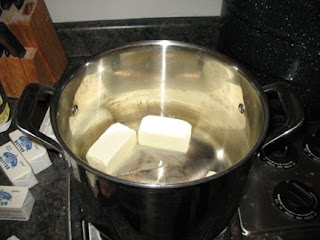 Step 2: Melt the butter in a pot on LOW. You don’t want to cook it, just melt it. 1 pound (1 box) of butter fills 1 pint. We did quite a few jars today and ended up with extra butter, so be prepared with an extra jar or two if you’re doing more than a couple of pounds of butter. Half pints also work well–1/2 lb butter per half pint.