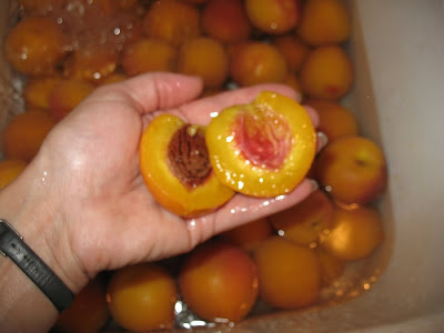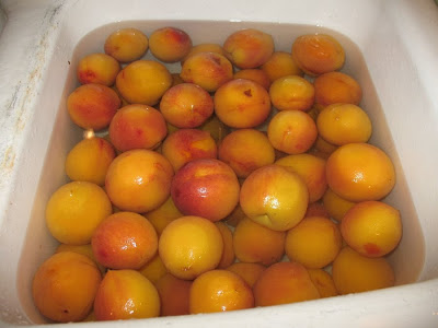Then take them out of the boiling water and put them immediately in cold water. I have a really cool metal basket thing (you can see the handles in the above picture) that allows me to put a basket of peaches in the water and then pull them all out and transport them to the sink. Slick. Much better than fishing one peach at a time out of the pot of boiling water, but that works too.