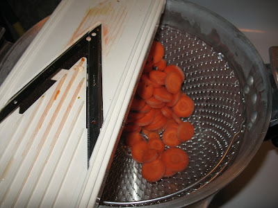 Once they were all nice and sparkly clean, I used my crazy slicer to slice them into rounds. The blade on my food processor cuts them a little too thin for me, so I had to hand slice them with the V-slicer tool thingy.