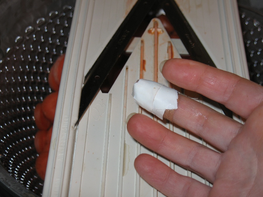 The slicer is for food, not fingers. This is where knowing a bit of first aid is a good thing.<