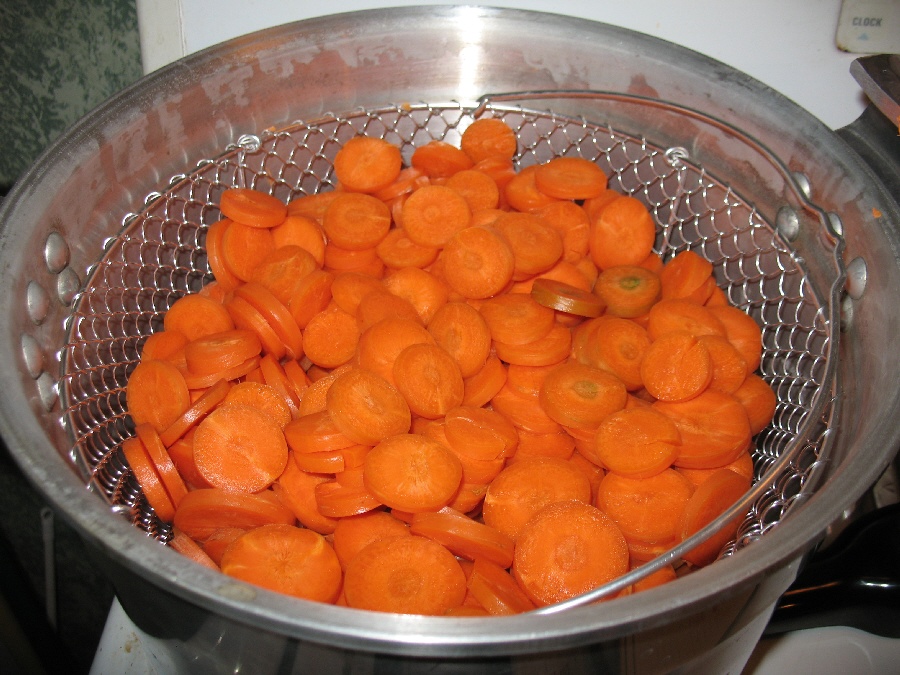 Once the carrots are sliced, you can put them right on the dehydrator trays if you want or put them in a steamer basket and steam them for a couple of minutes (put the lid on the pot and boil the water under the carrots so it is steaming for two minutes). You could also do a boiling water blanch on them for 2 minutes if you don’t have the capability to steam blanch them.