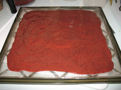 When the fruit is all mushy, prepare your dehydrator trays. Some dehydrators come with fruit leather sheets. You can get fancy sheets for the Excalibur that work really well, but I’m too cheap, so I use plastic wrap. I laid it over the mesh and then tucked it under the sides loosely. I really should have wrapped it clear around the solid part of the tray even though that makes it a little sticky sliding in the dehydrator. I know I’ve done it that way in the past and it dried nice and flat. When the plastic wrap starts heating up it shrinks and if it’s pulling on the edges of the mesh it can pull it up on the sides and you’ll have to get in and un-tuck a bit so it can lay flat again like I had to do. Not a huge problem, but kind of a hassle.
