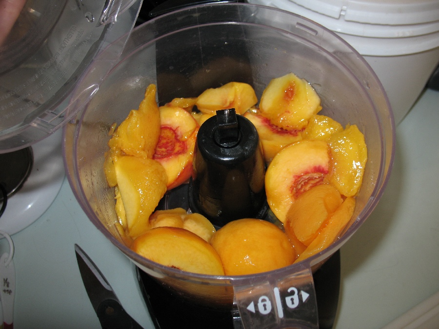 Prepare your fruit as you would for any other canning or freezing experience–wash, peel if necessary, and pit if necessary. Then get your fruit in your blender or food processor. This fruit doesn’t have to be nice and perfect. A lot of times I save the reject fruit when I’m canning and use it for fruit leather. I did two batches this time–one straight peach and the other peach/cherry with some frozen cherries I had from last year.