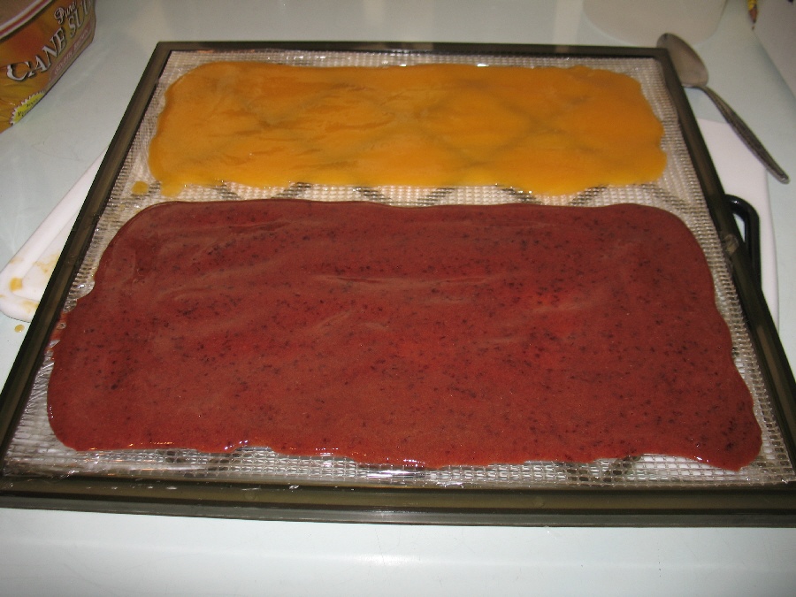 I also added some raspberry extract to the peach batch just for fun. Feel free to experiment. I once did peach with cinnamon in it and that was really tasty also. I just kind of guess at the amounts. You can always taste the fruit mush and see if you want to add more, but remember the flavors concentrate as it dries so don’t get too carried away either!