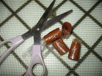 Then start rolling, taking the plastic wrap with you as you go. If you poured in strips or dots or whatever, just cut the plastic wrap in between your leathers before you roll them up.