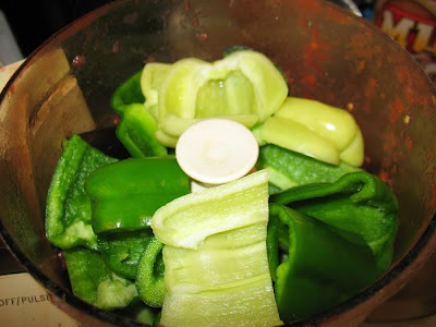 Next add the peppers. One bell pepper and one jalepeno pepper for each quart of chopped tomatoes. I usually have about 12 quarts of tomatoes, so I add 12 bell peppers. Core them and get all the seeds out.