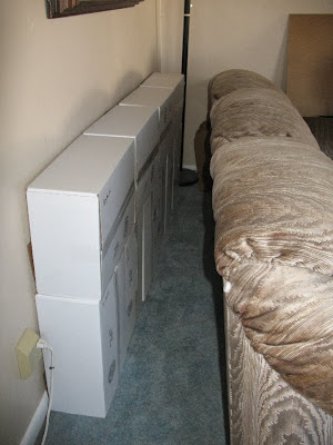 I put the taped bottoms of the boxes toward the couch to reduce the rub factor and labeled the bottoms so I knew what each box was from the side I could see when I pull the couch out. I pushed the couch back against the boxes and only lost about 10 inches of space in the living room. I made a map on one of the end boxes also so I knew what was back there without having to pull the couch out unless I want to get to some of it.
