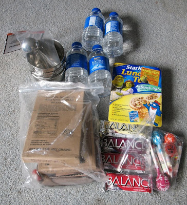 Now the food and water. We have utensils and a stainless steel cup that can be used for cooking as well, bottled water (small size), a tuna/cracker pack, one MRE, Power Bar type bars, and hard candy (suckers, smarties, candy necklaces, etc.) Try to pack them foods they will eat. I’m guessing the MRE will be the last to get eaten here, but maybe I’m just being prejudiced because I don’t like MRE’s. Don’t put peanut butter power bars in your kid’s pack if they don’t like peanut butter. Don’t put tuna in if they don’t like tuna. You get the idea. Food and clothes will need to be rotated, so do not put together a kit when your kid is 4 and let it just sit until the emergency happens when he is 14. These kits need checked and rotated at least once a year–better every 6 months.