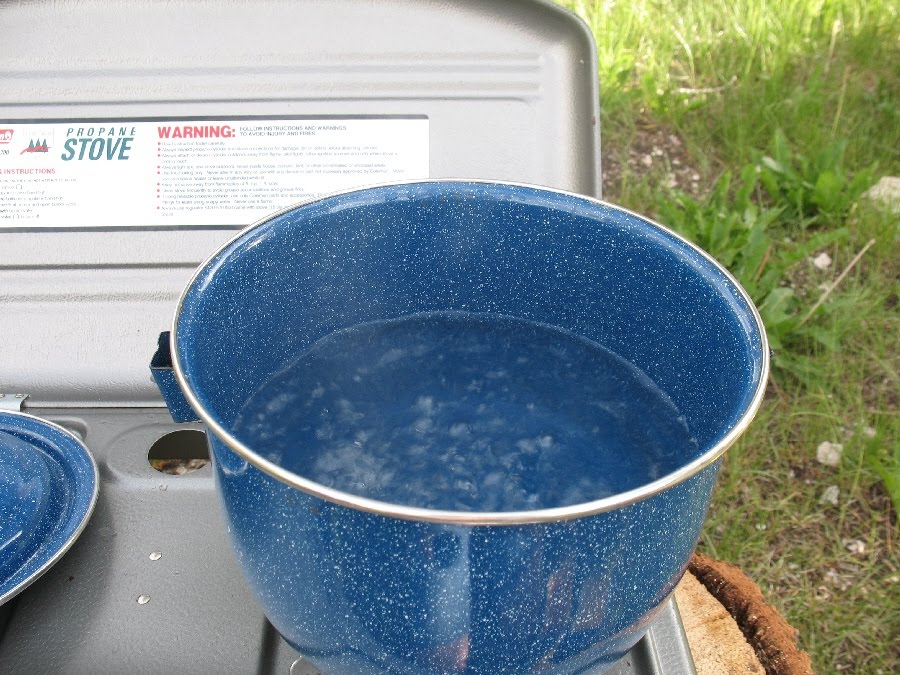I didn’t bring any measuring cups, so I just used a mug and kind of guessed. I also wanted a little hot water for washing the bowls after, so I’m heating too much water here. While your water is heating, find whatever you need for serving, or just hang out and play cards with your friends.