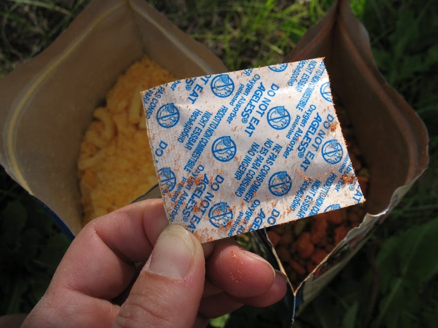 Once the water is boiling, open your package and take out the oxygen absorber. This little packet is totally harmless as long as you don’t eat it. It just helps keep the food fresh and dry in the package. Each food pouch had an easy tear strip at the top and flared bottom so it could sit on your table or the ground or whatever and hold itself up. Nice.