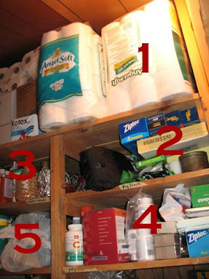 2. This kind of runs with shelf 4–heat, light, kitchen tools (apple peeler, potato masher, hand meat grinder, etc). Firestarters, matches, lightsticks, candles, lamp oil, ziplocks, foil, the games we don’t want the kids getting into and losing the pieces . . .