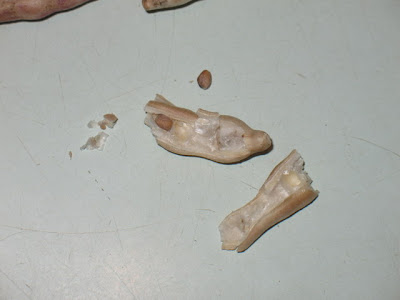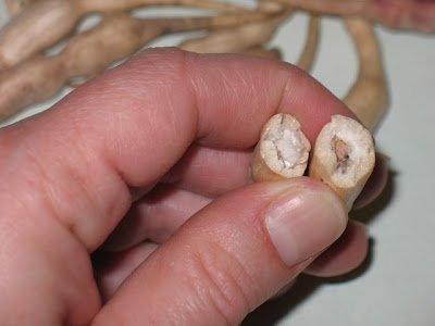 Next, let them dry on the plant. You’ll want to use early radishes for your seed so they have plenty of time to mature. The first year I tried this I used a later radish and the seeds didn’t mature enough to be viable the next spring. When the seed pods are dry, pull them off the plant. If you want, you can pick the whole plant before they’re all dry and hang it in a shed or someplace to let the pods finish drying (like if you’re going to get a long rainy spell at the end of your garden season or if your freeze is coming a little sooner than you expected). You’ll have better success just letting them dry while the plant is in the dirt. Now the pods look like this: