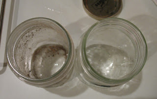 When I’ve eaten the fantastic food (well, most of the time it’s fantastic) out of my canning jars and washed them out, it’s time to store them until I need to can something else. I like to wash the used lid and ring along with the jar and then put the clean lid UPSIDE DOWN on the top of the clean jar and screw it on tight with the ring. The reason I don’t put the lid on right side up is that the gummy stuff sometimes sticks to the rim of the jar and then when I’m ready to use that jar I have to scrape crusty gummy ick off the rim before I can use it. Upside down, I don’t get any of that. I’ll let you just look at the pictures to see why you want to store your jars with lids on. On the left, a jar just stored in a box, on the right a jar stored in a box with the lid on it. The lid keeps the jar nice and clean. Of course you’ll still want to wash it before canning something new in it, but wouldn’t you rather start with a mostly clean jar than one that’s all dirty? Sometimes it’s even better than just dirty ick–you’ll get dead spiders/bugs in them as well–super gross! So it’s worth it to save the used lid and keep it on the jar until you’re ready to use it again.