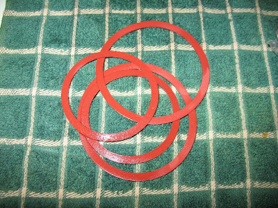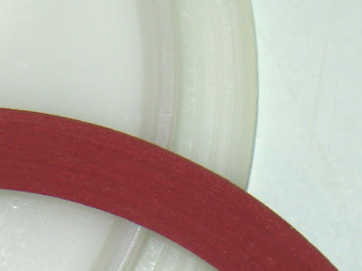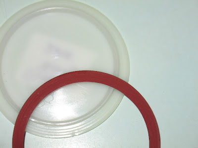 To use it again, Tattler recommends putting the ring on the opposite direction that it was the last time you canned with it. You can see the little grooves the white lid leaves in the rubber ring if you look close–those will let you know which way to set the rubber ring next time. The next two pictures show the rubber ring taken off the lid and turned over to show the grooves. You can see the grooves better in real life than they are showing up in the pictures. You might have to get your reading glasses out, but you’ll be able to tell which way the ring went so you can turn it over next time. (If you click the pictures they enlarge and you can see the grooves a little better.)