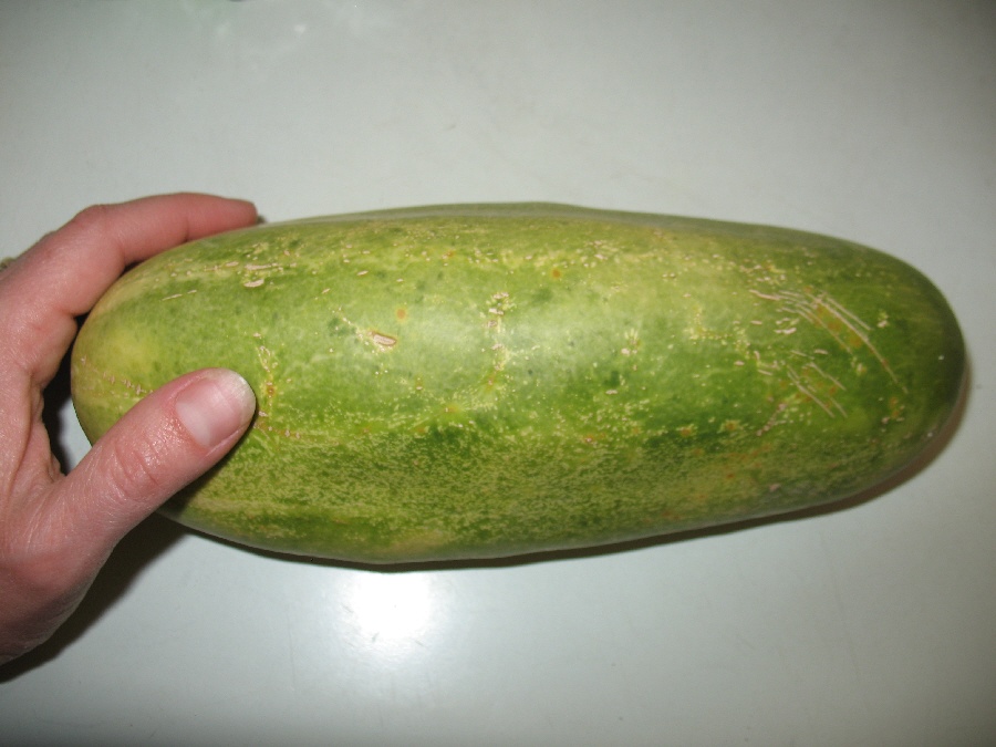 And this big guy is a cucumber I was letting go to seed. You let them ripen beyond the eating stage until they’re big and soft. This one’s plenty big, but I’m letting it sit in the house for another week or so before getting to the seeds just to make sure it’s nice and mature. It is a non-hybrid variety. Saving the seeds from a hybrid cucumber will result in who knows what kind of plants when you plant them, but seeds from non-hybrids will reproduce the same kind of plant they came from. Thanks, Mr. Mendel.